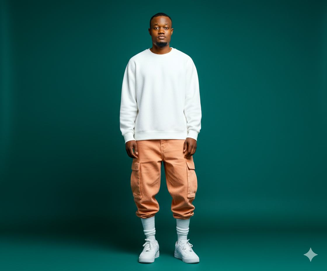 Male model (same face & hairstyle as uploaded photo, do not change facial expression). Oversized white sweatshirt, apricot orange oversized combat jeans, styled white or Nike sneakers and white ribbed socks. Deep Teal Green-toned studio background. Soft cinematic glow highlighting skin and fabric textures. Fashion editorial × futuristic. Model stands tall elegantly with relaxed posture.PROMPT Male model (same face & hairstyle as uploaded photo, do not change facial expression). Oversized white sweatshirt, apricot orange oversized combat jeans, styled white or Nike sneakers and white ribbed socks. Deep Teal Green-toned studio background. Soft cinematic glow highlighting skin and fabric textures. Fashion editorial × futuristic. Model stands tall elegantly with relaxed posture.0 Comments 0 Shares 723 Views 0 Reviews1