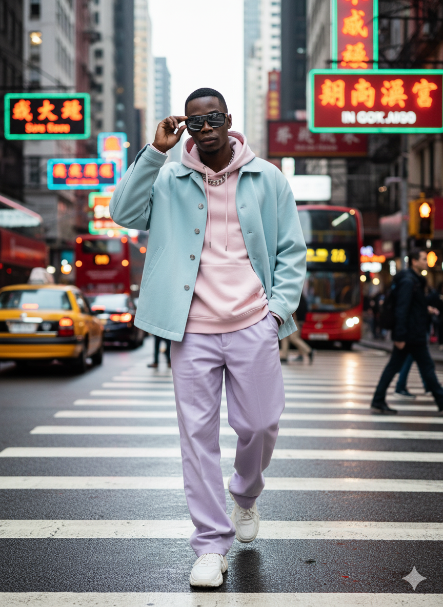 Shot from a slightly low angle to enhance his presence, the image has a dramatic, cinematic feel with sharp focus on the model and his clothing's intricate textures, while the surrounding traffic and city lights create a beautiful, abstract bokeh effect.A high-fashion street style photograph captured in the bustling heart of a metropolis, showcasing the young man from <UPLOADED IMAGE> as an unapologetic, fearless Gen Z icon. He is confidently striding down the middle of a busy zebra crossing, his pose dynamic and fierce. One hand is casually tucked into the pocket of his oversized, flowing pastel-colored trousers, while the other hand is dramatically adjusting a pair of large, dark designer sunglasses that conceal his eyes. He is wearing an oversized, loose-fitting pastel blue jacket over a matching pastel pink hoodie, creating a soft yet bold color contrast against the urban environment. The large, reflective sunglasses, a thick silver chain necklace, and chunky white platform sneakers complete his avant-garde streetwear look. The city around him is a vibrant blur of motion; yellow taxi cabs, bright red buses, colorful signboards with blurred Mandarin and English text, and hurried pedestrians are all rendered with motion blur, emphasizing his sharp focus and central position. The bright, high-contrast city lights and bold signage provide the background's rich color palette. Shot from a slightly low angle to enhance his presence, the image has a dramatic, cinematic feel with sharp focus on the model and his clothing's intricate textures, while the surrounding traffic and city lights create a beautiful, abstract bokeh effect.0 Comments 0 Shares 635 Views 0 Reviews -