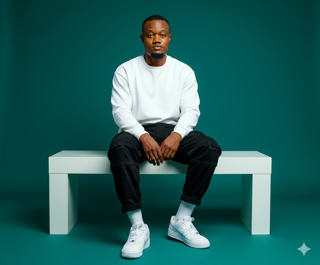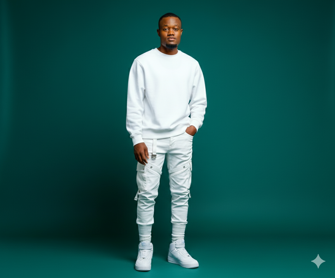 Male model (same face & hairstyle as uploaded photo, do not change facial expression). Oversized white sweatshirt, white combat jeans, styled white or Nike sneakers and white ribbed socks. Deep Teal Green-toned studio background. Soft cinematic glow highlighting skin and fabric textures. Fashion editorial × futuristic. Model stands tall elegantly with relaxed posture. Ultra realistic, high-resolution, editorial style.PROMPT Male model (same face & hairstyle as uploaded photo, do not change facial expression). Oversized white sweatshirt, white combat jeans, styled white or Nike sneakers and white ribbed socks. Deep Teal Green-toned studio background. Soft cinematic glow highlighting skin and fabric textures. Fashion editorial × futuristic. Model stands tall elegantly with relaxed posture. Ultra realistic, high-resolution, editorial style.0 Comments 0 Shares 688 Views 0 Reviews1