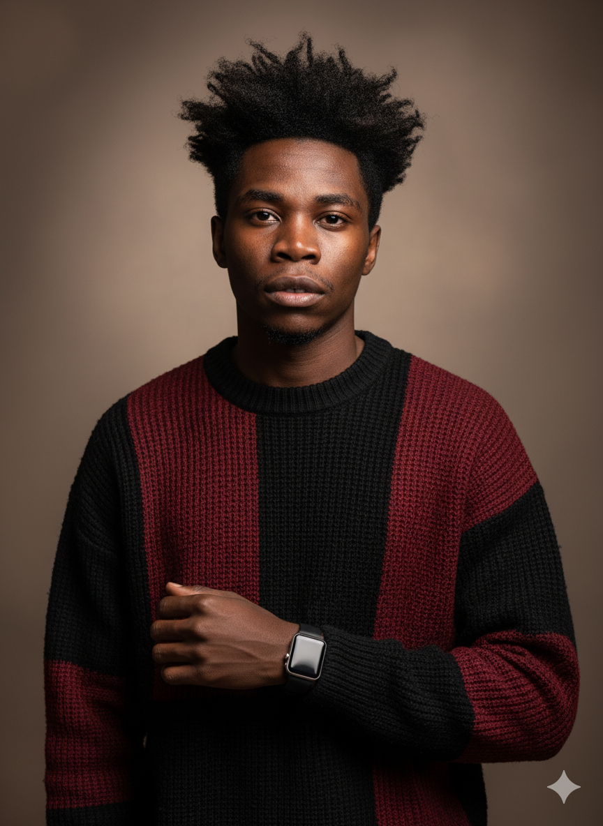 The background is soft, minimal, and subtly blurred to emphasize a contemporary fashion-forward vifac. Cinematic lighting, ultra-detailed, realistic textures, and a polished editorial aesthetic same face.Without changing my facial features, create a stylish, 4k modern portrait of a young boy 23 year with same refference face Messy valume hair, wearing a loose-fitting black and dark red woolen sweater. single accessorized with a watch. The background is soft, minimal, and subtly blurred to emphasize a contemporary fashion-forward vifac. Cinematic lighting, ultra-detailed, realistic textures, and a polished editorial aesthetic same face.0 Comments 0 Shares 606 Views 0 Reviews -