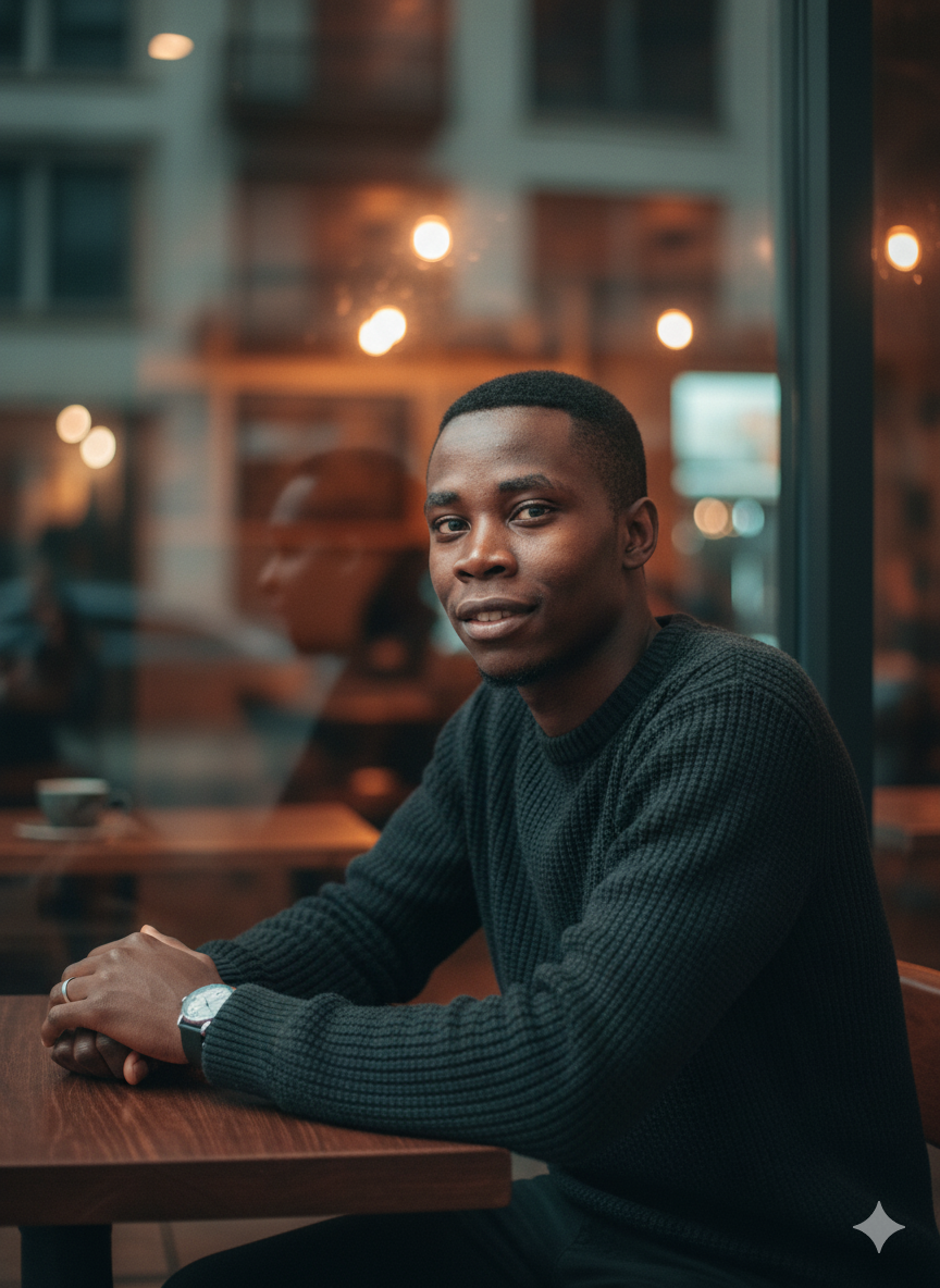 Post: HDR (Highlights-25, Shadows-20), soft S-curve contrast, subtle film grain, cool toned grading on subject balanced with warm background for gentle tonal split (blue/green vs orangel. Natural vignette, moderate clarity and sharpening, skin texture preserved, no smoothing Cinematic urban portrait, contemplative, realistic, soft lighting, window reflec tion, intimate modern aesthetic.""Ultra-realistic portrait in an urban café with a melancholic, intimate mood, seen through subtle glass reflections that separate the subject from a warm, bustling background. Sub-ject seated sideways at a dark table, torso slightly tilted right, gaze direct and subtly se ductive, relaxed friendly expression, level shoulders. Forearms resting gently on the table, hands relaxed one over the other. Wearing dark charcoal chunky knit crewneck sweater with minimalist wrist and finger accessories. Soft directional key light from front left, high angle, forming modified Rembrandt/loop lighting with -2:1 contrast, complemented by a large white reflector camera right for fill. Varm ambient background lights create soft rim accents. WB-5500K enhancing amber range bokeh. Full frame camera with 85 mm lens at ~1.5 m, f/1.8, 1/160 s, 150 200, Linear Response profile. single-point AF on nearest eye. Medium close up vertical 45, rule of thirds composition with nearest eye on upper-left intersection and -20% free space. Foreground includes subtle glass reflection-soft-focus cup, background deeply blurred with warm cinematic bokeh. Post: HDR (Highlights-25, Shadows-20), soft S-curve contrast, subtle film grain, cool toned grading on subject balanced with warm background for gentle tonal split (blue/green vs orangel. Natural vignette, moderate clarity and sharpening, skin texture preserved, no smoothing Cinematic urban portrait, contemplative, realistic, soft lighting, window reflec tion, intimate modern aesthetic."0 Comments 0 Shares 621 Views 0 Reviews -