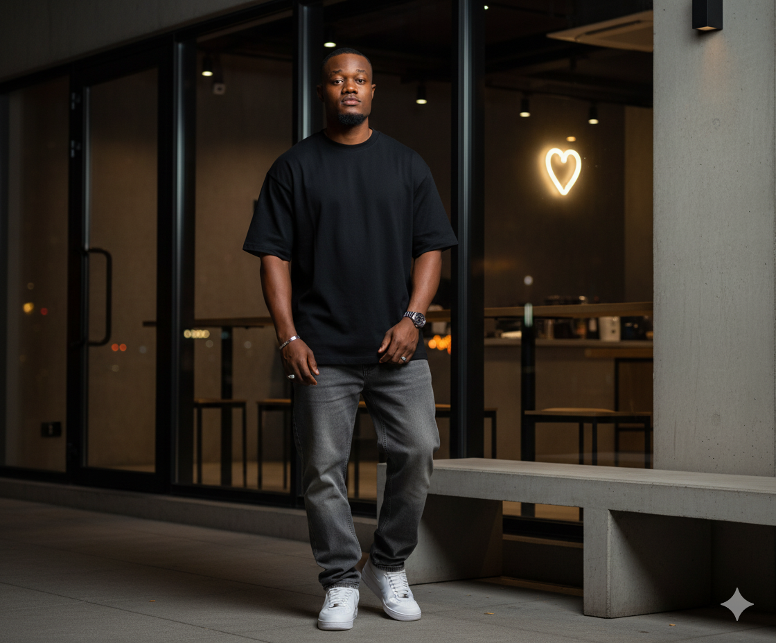 Ultra-detailed 8K cinematic portrait of a man with mascule body and slightly thin cheeks, same face and hairstyle, realistic skin texture, soft cinematic lighting with moody standing outside a modern minimalist night café. Wearing black oversized t-shirt, gray baggy jeans, white Nike Air sneakers, titanium braclate, watch on right hand, and ring, posing casually leaning with one side. High dynamic range, professional studio photography look, photorealistic 8K resolution.PROMPT Ultra-detailed 8K cinematic portrait of a man with mascule body and slightly thin cheeks, same face and hairstyle, realistic skin texture, soft cinematic lighting with moody standing outside a modern minimalist night café. Wearing black oversized t-shirt, gray baggy jeans, white Nike Air sneakers, titanium braclate, watch on right hand, and ring, posing casually leaning with one side. High dynamic range, professional studio photography look, photorealistic 8K resolution.0 Comments 0 Shares 701 Views 0 Reviews
