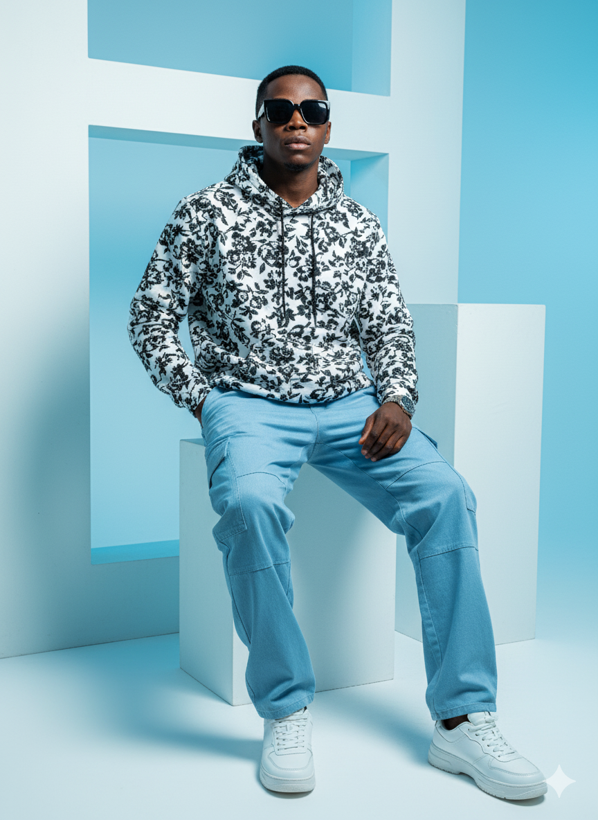 Ultra-realistic 20 stylish young man (refrence image given) with dark hair and a beard is seated in a cool pose. He's wearing a vibrant white black hoodie with a black floral pattern, open at the collar, paired with light blue cargo pants.