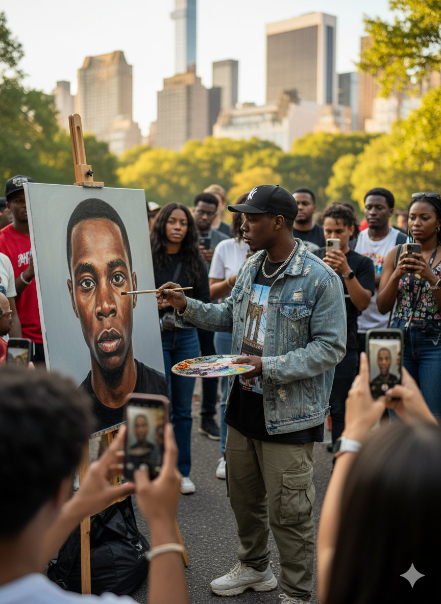 Using a Canon EOS R camera with a 50mm f/1.8 lens, f/2.2 aperture, shutter speed 1/200s, ISO 100 and natural light, half Body, photo Realistic Photography detail, Ultra hd, Color Correction, ultra hd, hdr, color grading, 8k""Edit the uploaded photo (face based on the reference photo). Ensure the face remains consistent with the person in the uploaded image, without changing facial structure, skin tone. Create an image of same man (from the attached photo) as a painter drawing a giant portrait of himself on a big board on a stand in a New York city park, geographically correct image, with many people watching, the man is wearing New york style street wear. Some people are looking and some people are taking photo of the painting with their phones. Using a Canon EOS R camera with a 50mm f/1.8 lens, f/2.2 aperture, shutter speed 1/200s, ISO 100 and natural light, half Body, photo Realistic Photography detail, Ultra hd, Color Correction, ultra hd, hdr, color grading, 8k"0 Comments 0 Shares 603 Views 0 Reviews