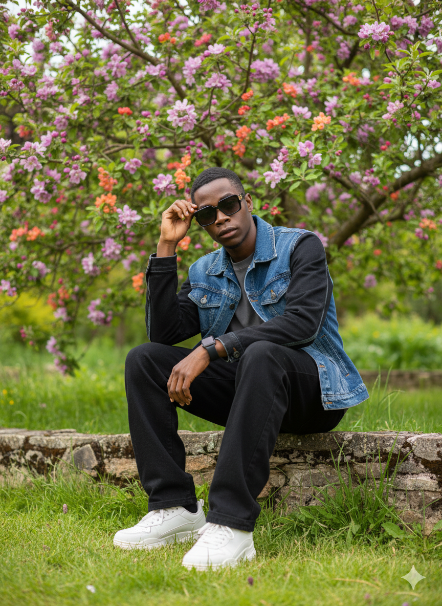 Create a photo of a same year boy, keep my face 100% same in the reference image, in a green garden, wearing denim jacket block, loose black pants, sitting he is in a stayle, with one hand touching side part haircut, chunky Sneakers, in the background is a blooming apple tree with bright green leaves and purple pink orange flowers, hand smart watch,clear delight DSLR level sharpness, natural colours, depth of field, realistic shadows, green ton, stylish sunglasses.Create a photo of a same year boy, keep my face 100% same in the reference image, in a green garden, wearing denim jacket block, loose black pants, sitting he is in a stayle, with one hand touching side part haircut, chunky Sneakers, in the background is a blooming apple tree with bright green leaves and purple pink orange flowers, hand smart watch,clear delight DSLR level sharpness, natural colours, depth of field, realistic shadows, green ton, stylish sunglasses.0 Comments 0 Shares 596 Views 0 Reviews