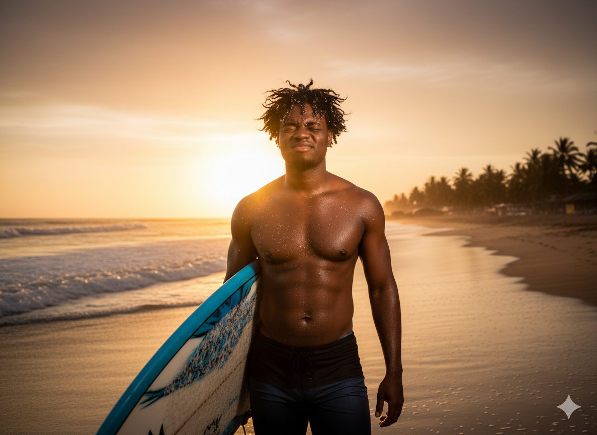 use provided image to create A surfer boy holding his board, eyes squinting into the sun. Salt in his hair is natural, droplets on his skin — raw, real, and wild. preseve facial features 100%