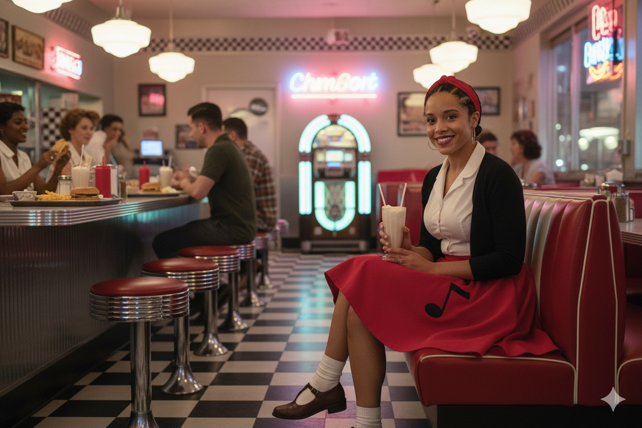 Using uploaded Image as a reference Create a ultra-realistic image of a woman in a vintage-inspired outfit, set in a retro diner