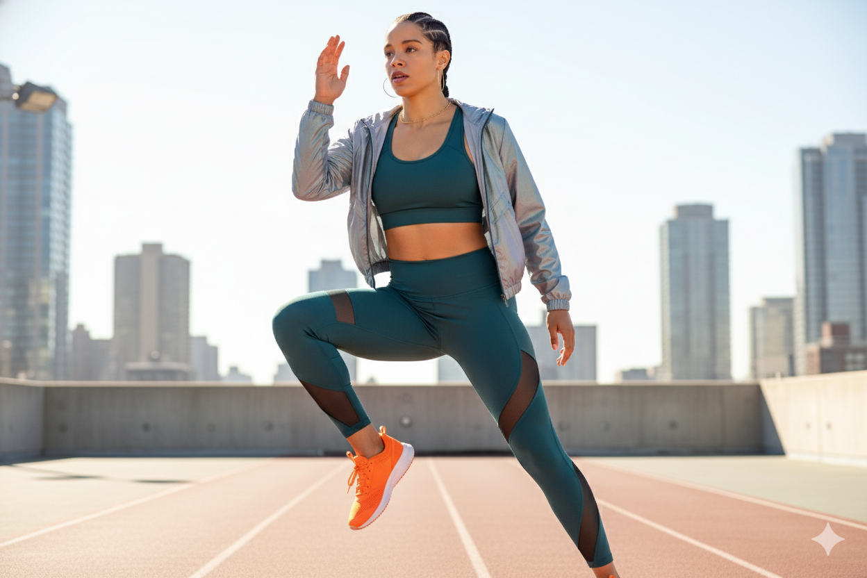 Full-body image of a model in a sporty, athleisure outfit, perfect for a fitness magazine