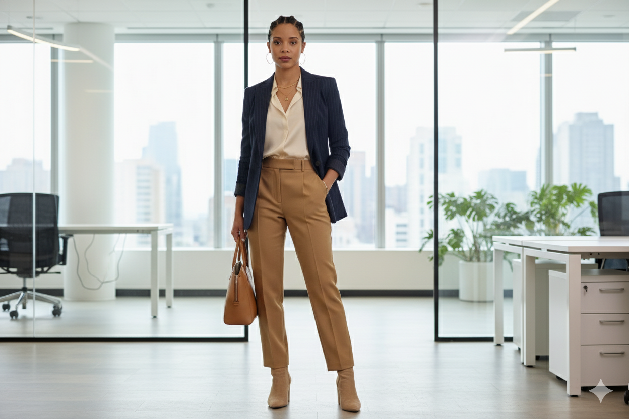 Full-body photograph of a model in a chic, business-casual outfit, set in a modern office.