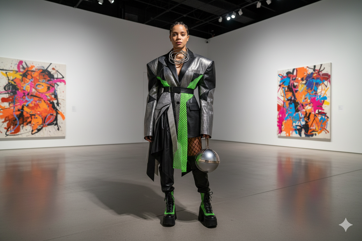 Realistic photo of a woman in a bold, avant-garde outfit, set in an art gallery.