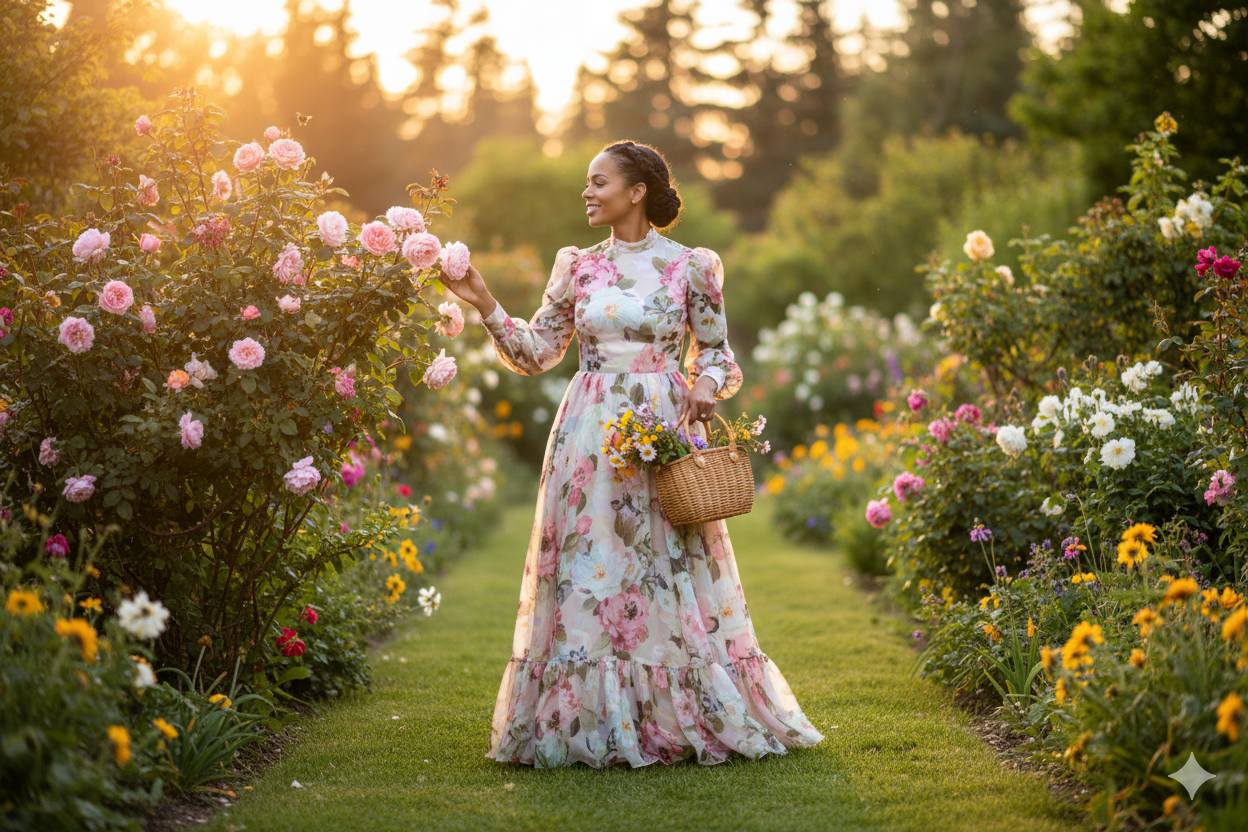 Realistic photograph of a woman in a romantic, floral dress, set in a blooming garden