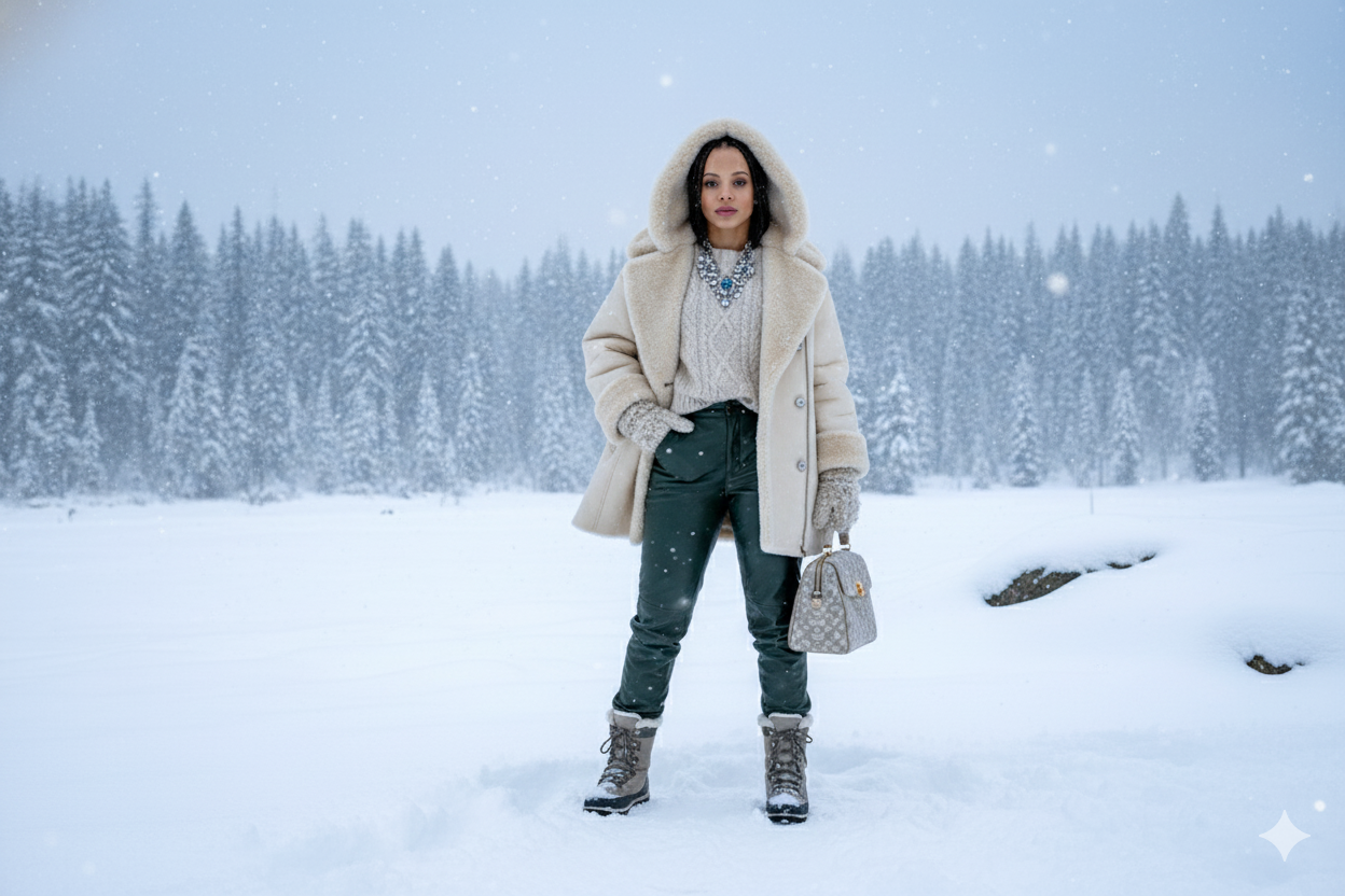 Realistic image of a woman in a luxurious, winter outfit, set in a snowy landscape.