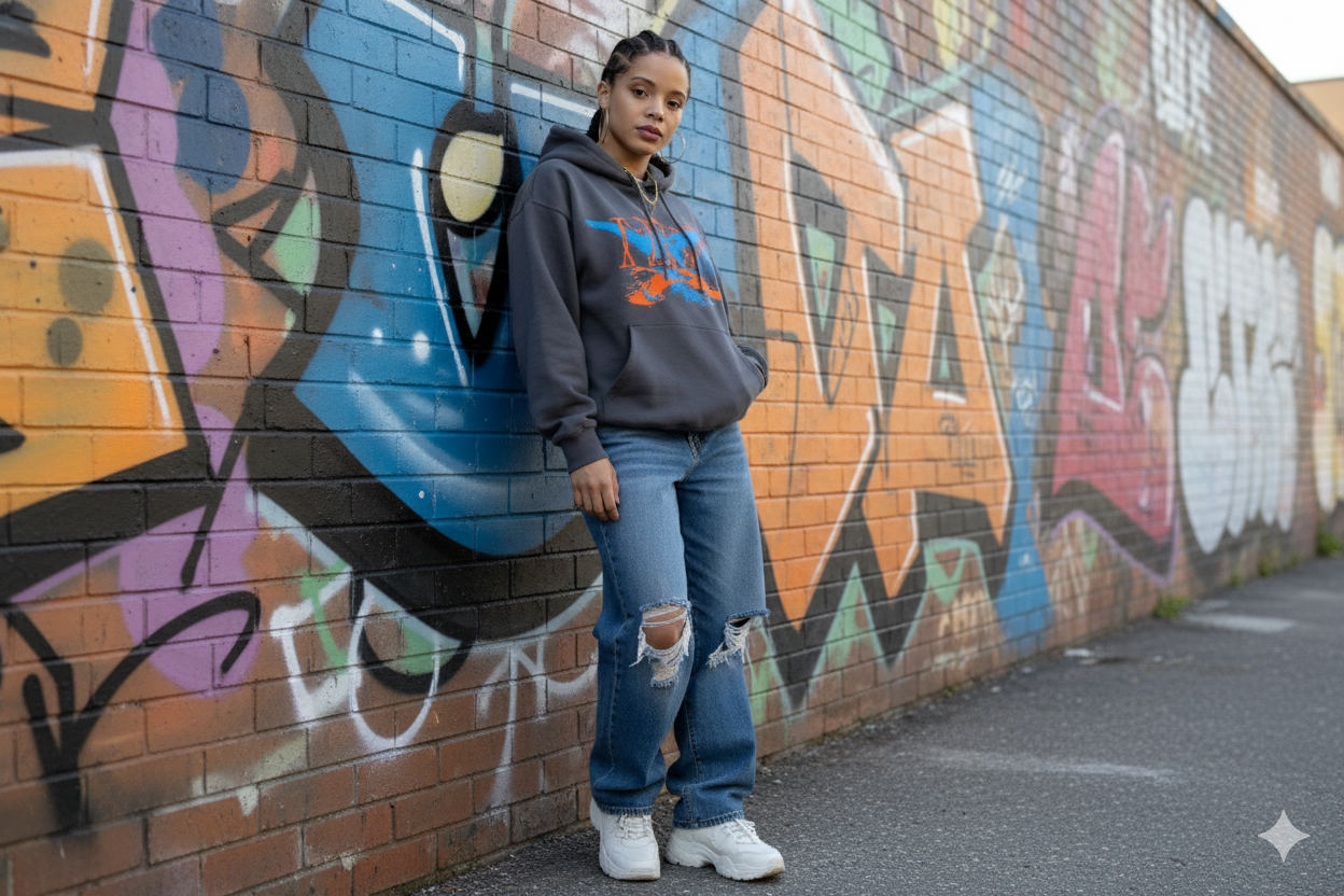 Use uploaded image as a reference to create Realistic photo of a young woman in a casual, streetwear outfit, set against a graffiti wall.